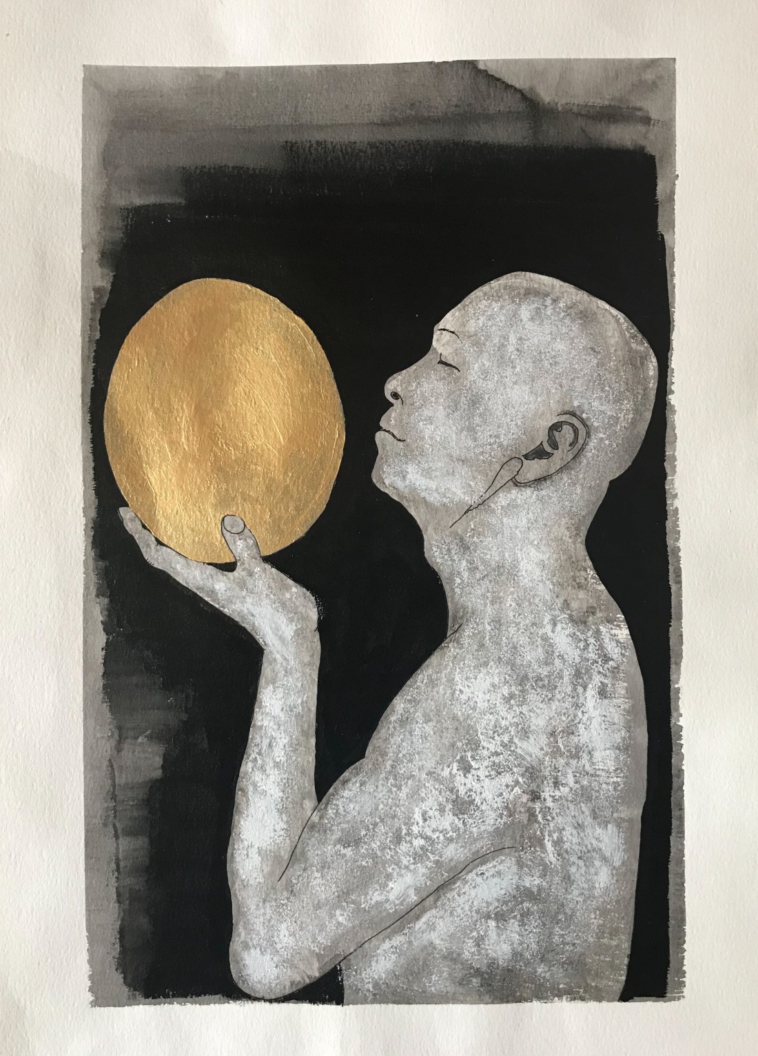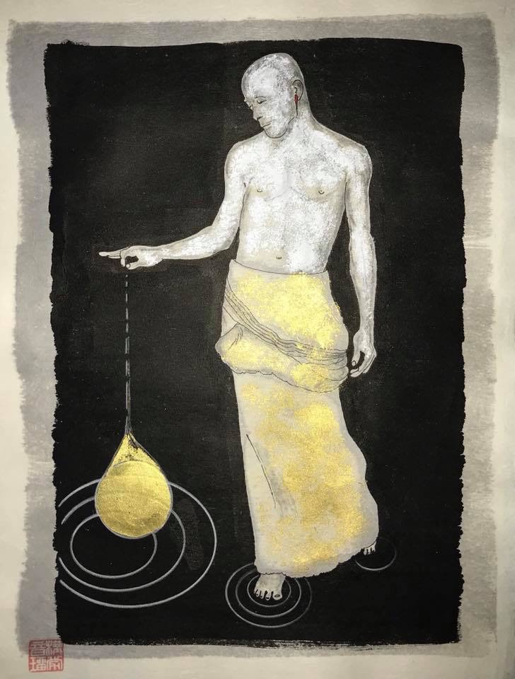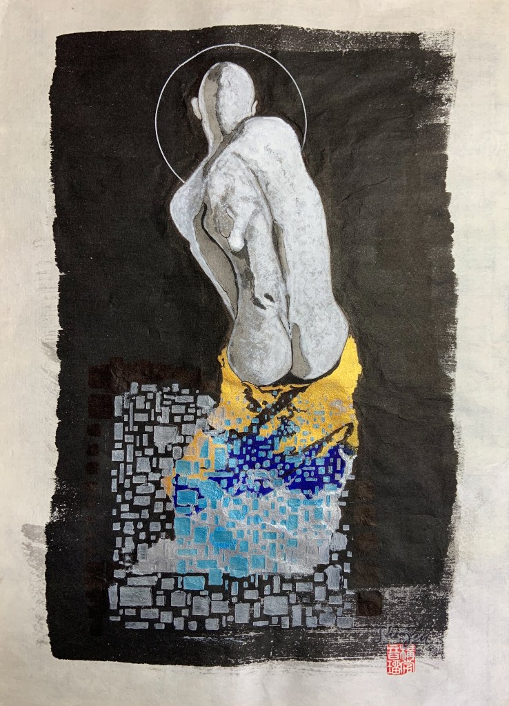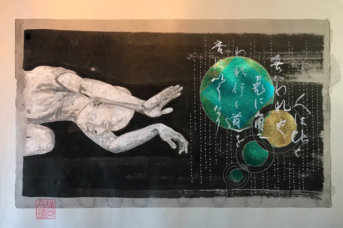 Encre de Chine avec acrylique et feuilles d’or oxydé sur washi.