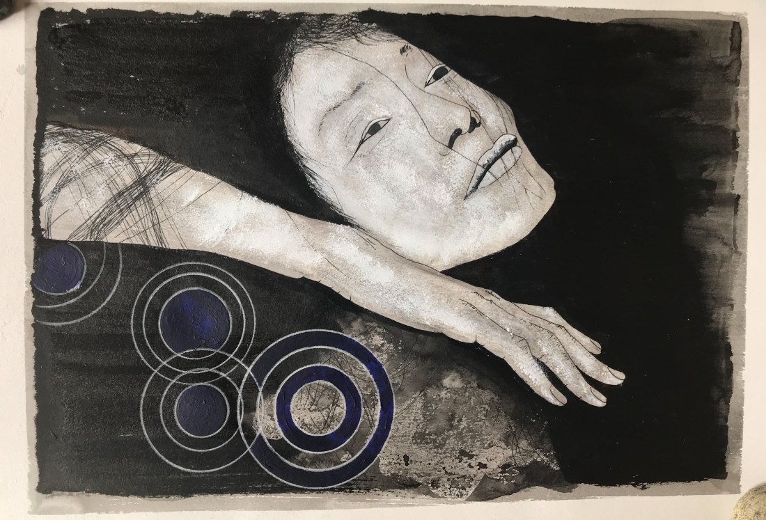 Média : Média mixte, acrylique avec encre de Chine et feuilles d’or oxydé sur «washi» (papier japonais)