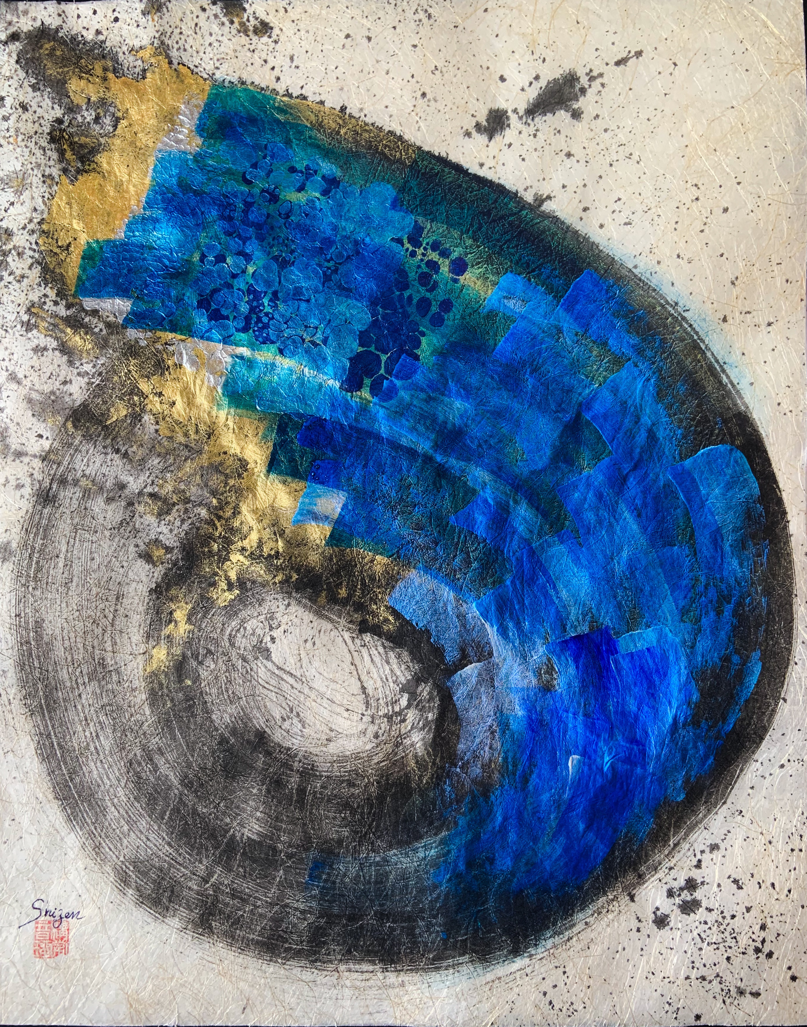 Encre de Chine et laque d’Urushi avec de feuilles d’Or sur washi.